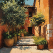 Featuring sunlit terracotta walls, lush greenery, and rustic architectural details, this Mediterranean-inspired landscape captures the timeless charm of a quiet Italian village. The rich earth tones and textured brushstrokes create depth, warmth, and an inviting atmosphere.