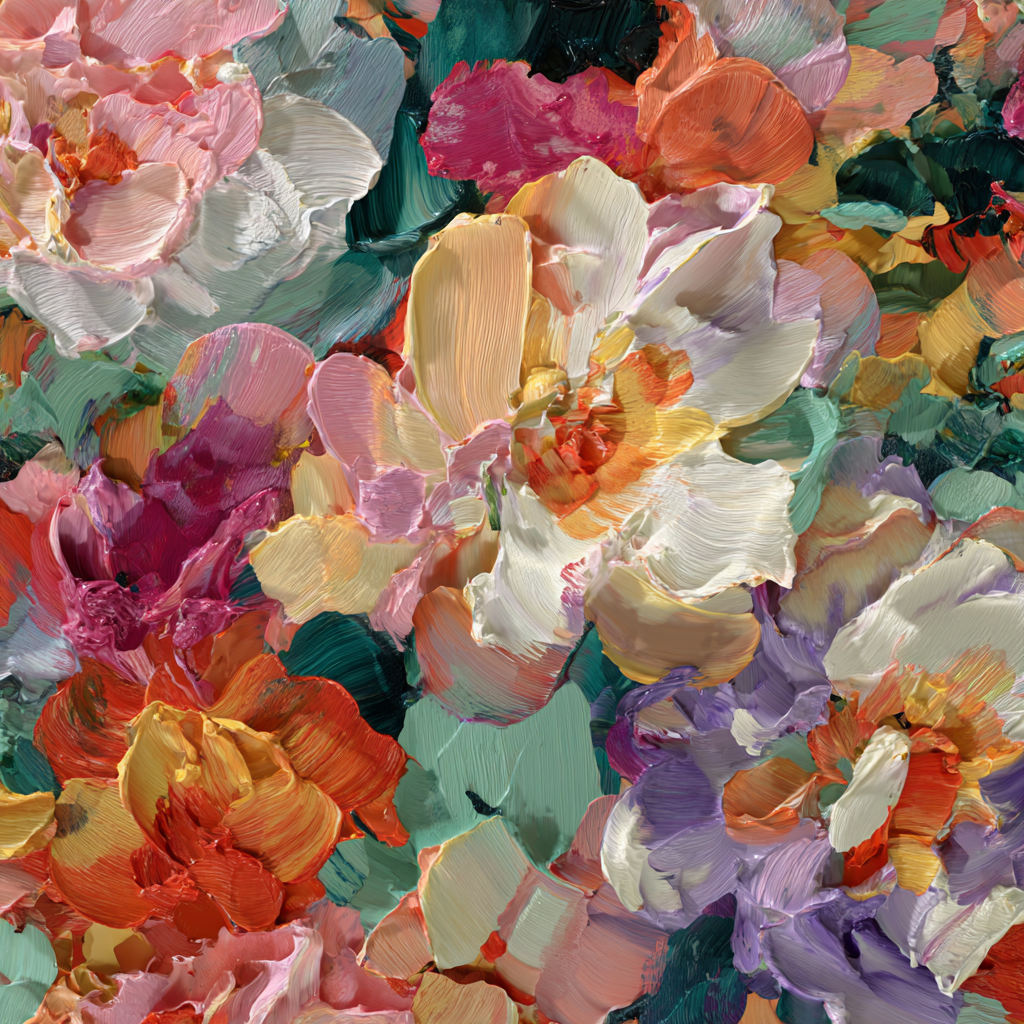 A stunning, high-contrast abstract floral painting rendered in a thick impasto style, where the paint is applied heavily to create deep texture and visible brushstrokes. The image is a close-up, wall-to-wall composition of lush, layered blossoms resembling peonies or garden roses.