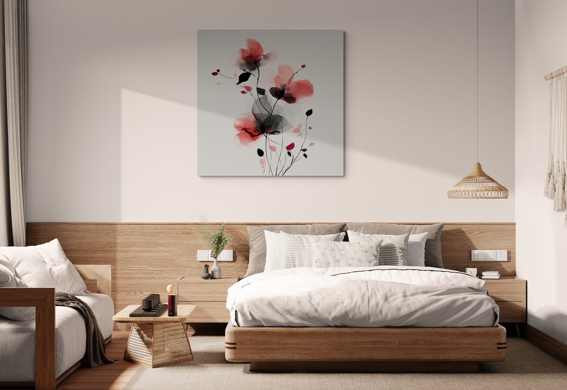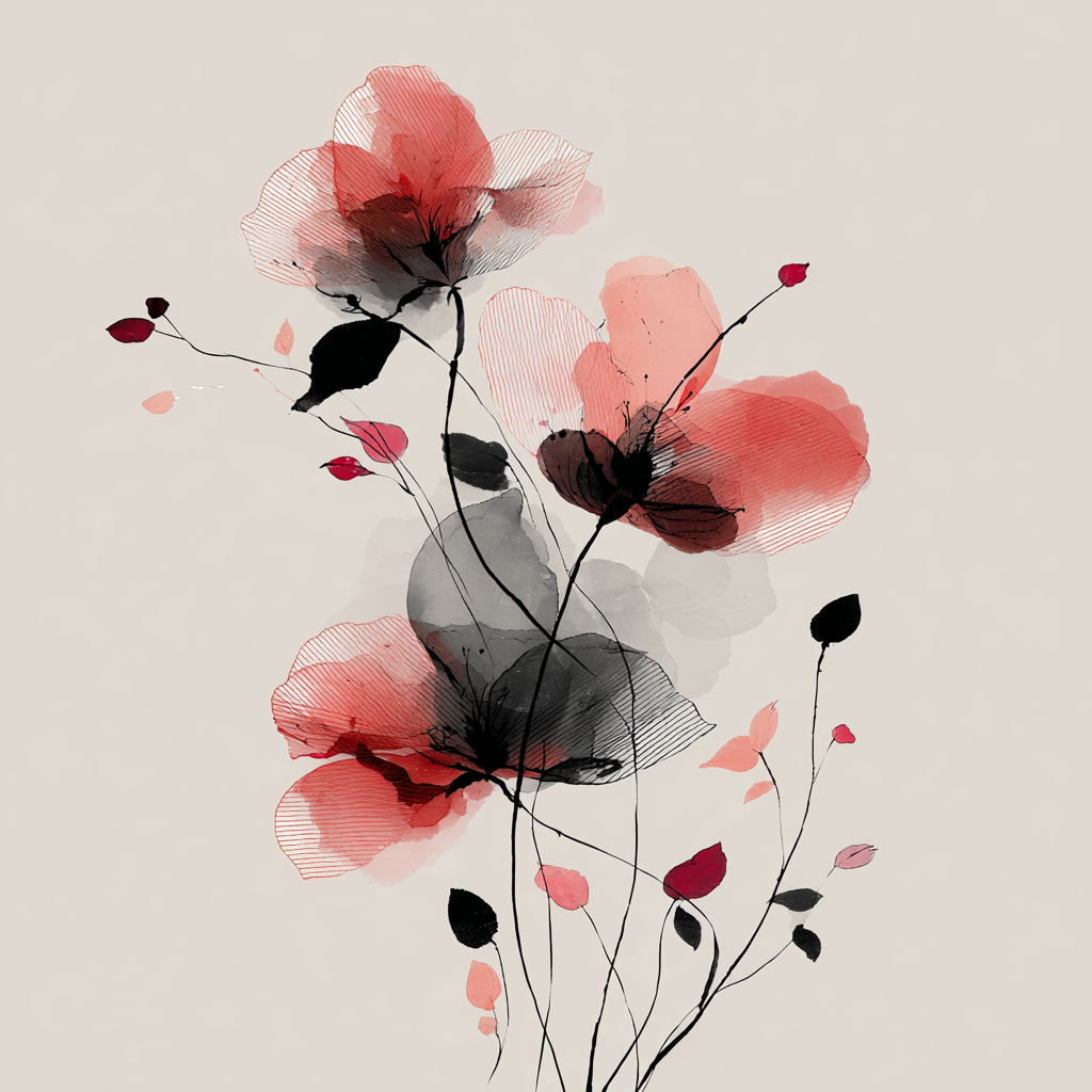 Subject: An elegant arrangement of stylized poppies or simple wildflowers on thin, wiry stems, with a focal point on the blossoms.