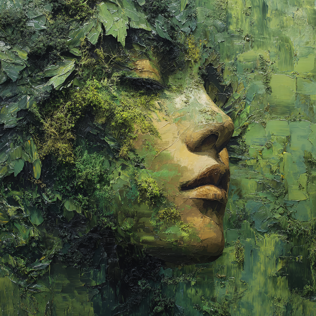 Integration of Nature: The face appears to be actively merging with or composed of natural elements, specifically vibrant green moss, lichen, and textured leaves that cover the hair and parts of the forehead and cheek.