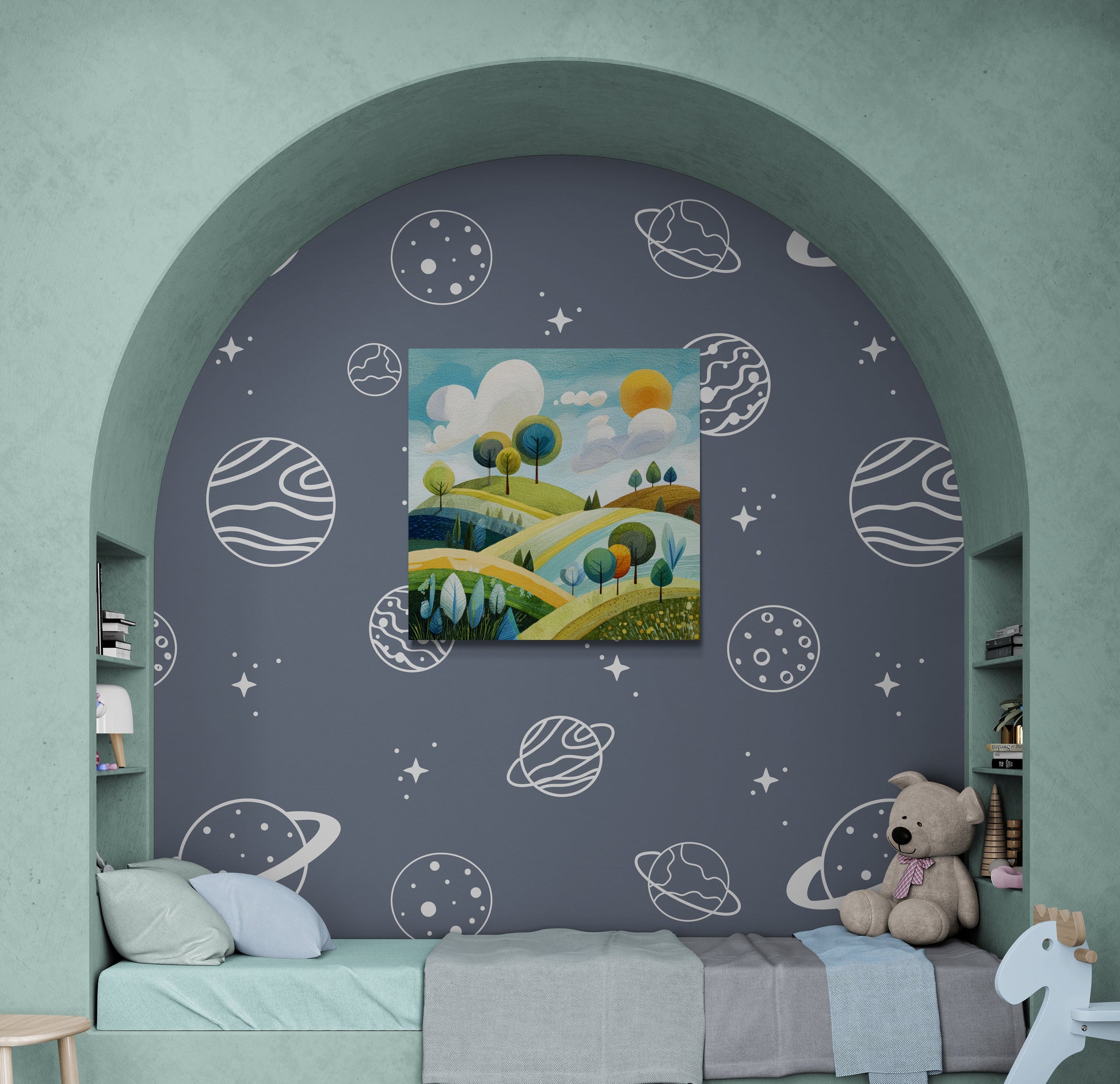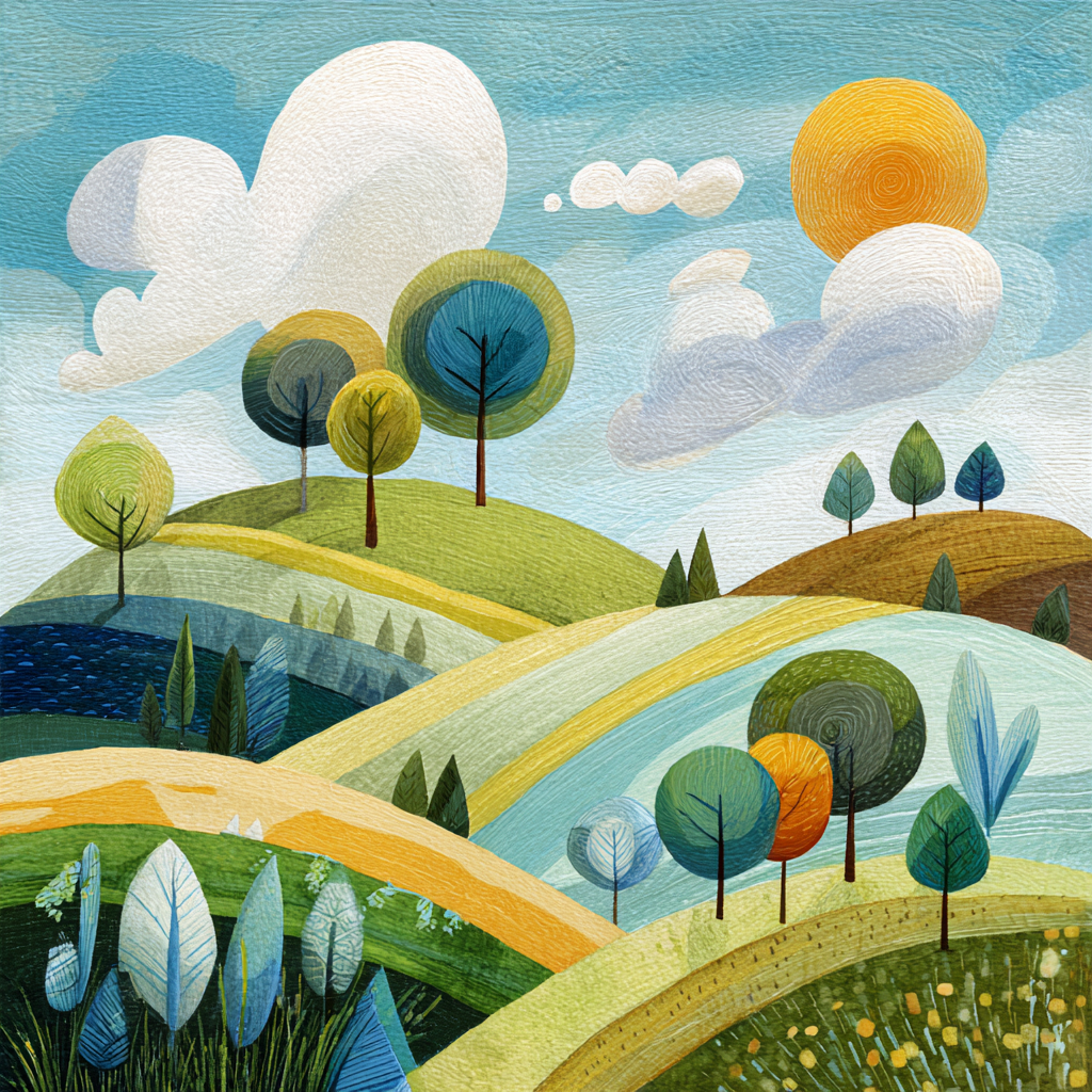The scene is filled with gentle curves, winding paths, and clusters of trees, each painted in calming shades of green, blue, and warm golden tones that suggest balance and renewal.