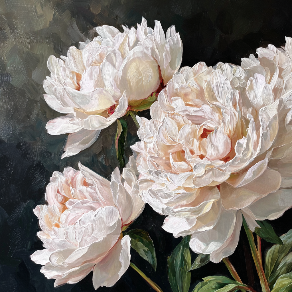 Featuring lush, layered petals in soft ivory and blush tones against a rich dark background, this floral painting captures the delicate beauty and romance of blooming peonies. The textured brushstrokes add depth and sophistication, making it a refined focal point for any room.